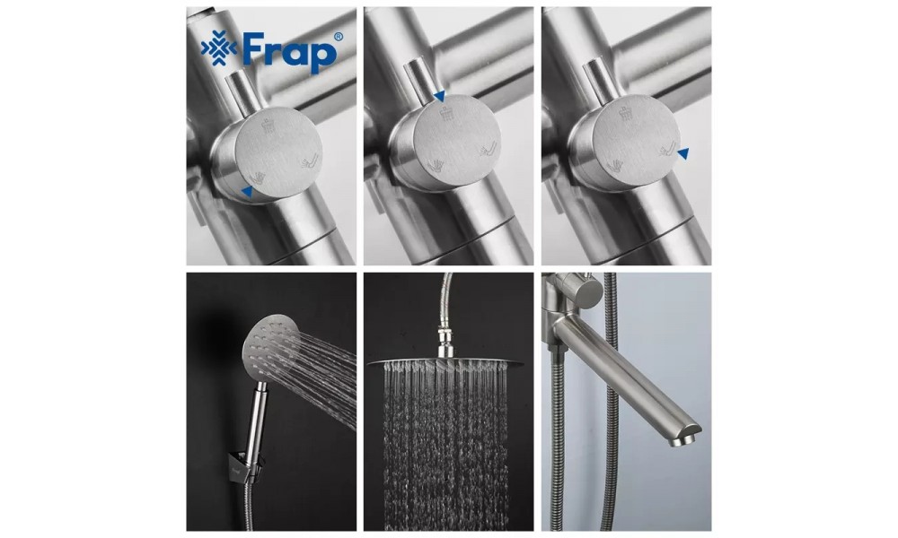Душевая система из нержавеющей стали Frap F24801 имеет стальной цвет, сатиновая поверхность. В комплекте душевой шланг и ручной душ из нержавеющей стали/металл. Излив у душевой системы Frap F24801 имеет длину 23 см. (230мм). Гаратния 3 года.