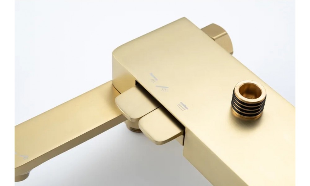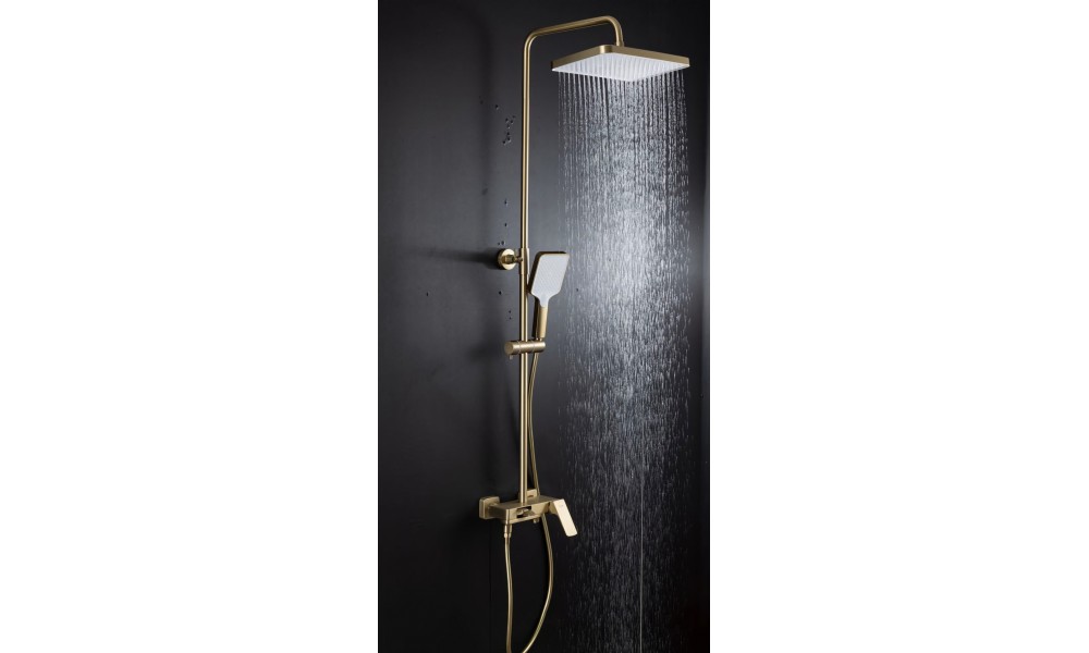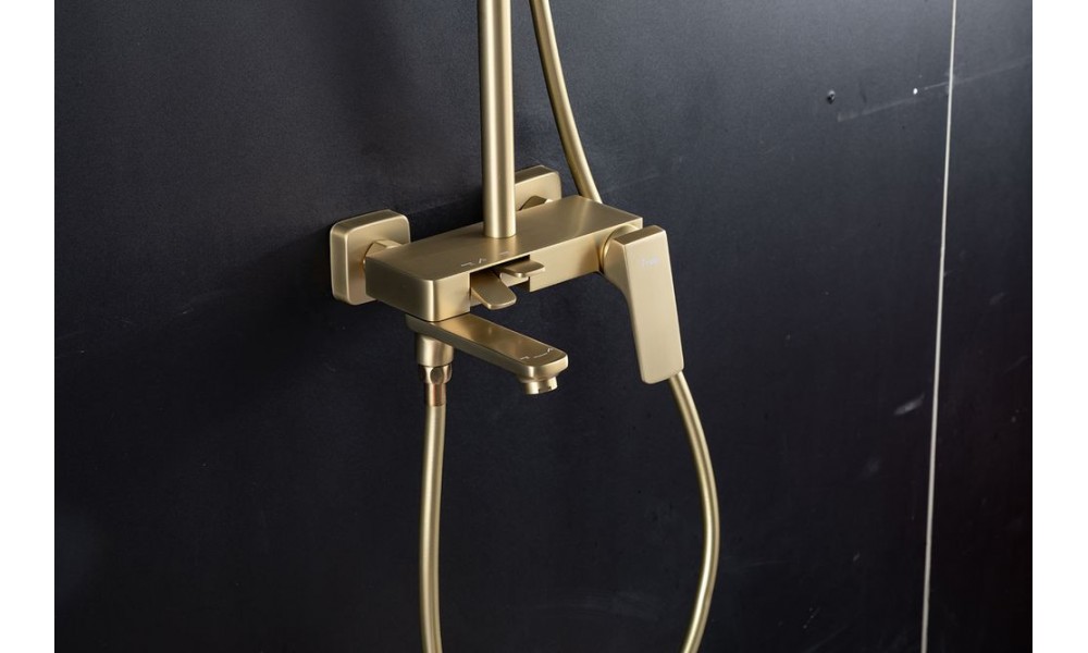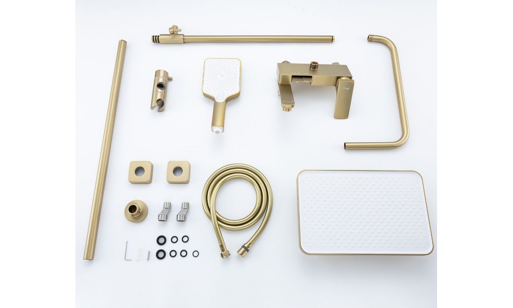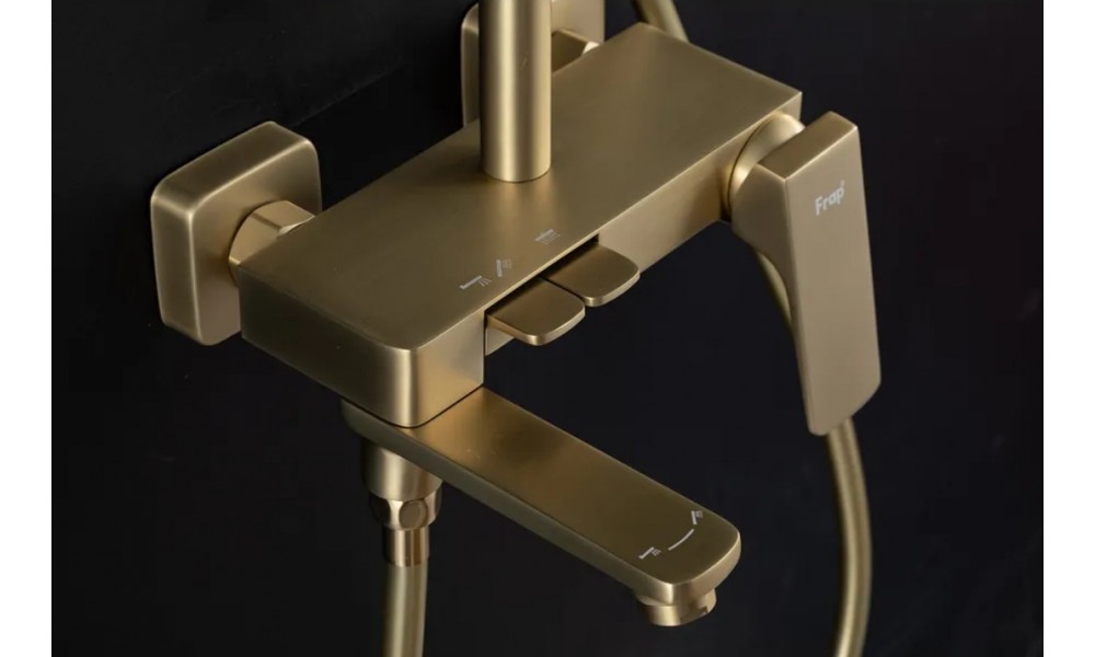 Душевая система Frap F2487-3 выполнена в цвете «Золотой-Сатин», который идеально подойдёт для современных интерьеров. Её клавишная конструкция обеспечивает удобное управление потоком воды, а латунный материал гарантирует долговечность и устойчивость к коррозии.
