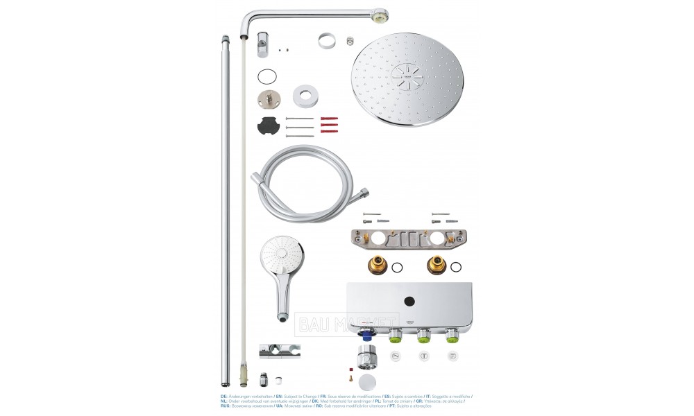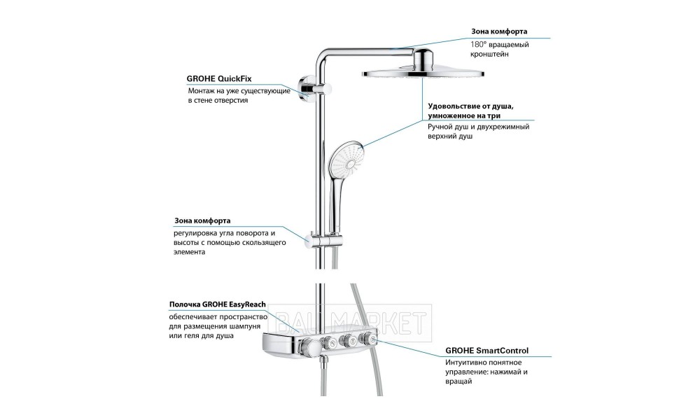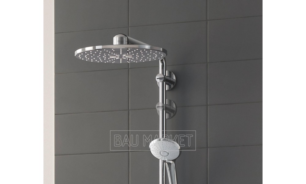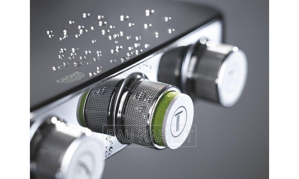 Технология GROHE DreamSpray гарантирует, что из каждой форсунки будет идти одинаковый напор воды. Силиконовые форсунки SpeedClean спроектированы так, чтобы их можно было легко очистить от известковых отложений. Технология GROHE TurboStat гарантирует постоянную температуру воды из вашего душа. GROHE SafeStop позволяет установить максимальную температуру на 38˚C, а SafeStop Plus предлагает увеличить это ограничение до 43˚C. Для дополнительной безопасности технология GROHE CoolTouch гарантирует, что корпус термостата не будет слишком горячим для прикосновения. Полочка EasyReach добавит в ваш душ комфорта, ведь шампунь и мыло всегда будут у вас под рукой. Надежная и ослепительная хромовая поверхность GROHE StarLight сохранит свой великолепный внешний вид на долгие годы. Благодаря системе GROHE QuickFix установка системы будет простой и быстрой, ведь кронштейн можно установить в уже существующие отверстия в стене.