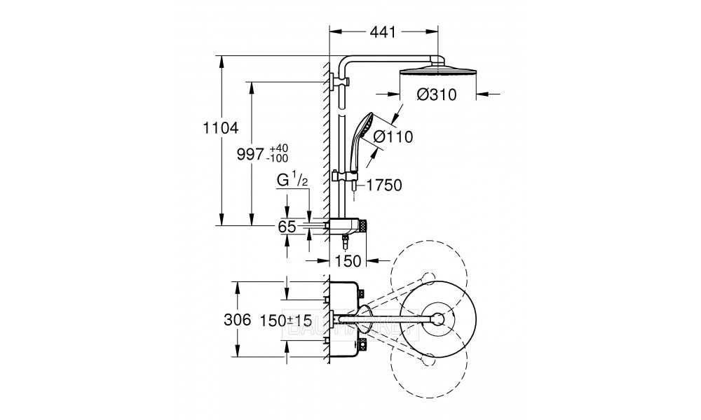Верхний душ диаметром 310 мм имеет два режима струи: мягкий и обволакивающий режим PureRain и стимулирующий, мощный режим ActiveRain. В ручном душе диаметром 110 мм - три режима струи: нежный Rain, водосберегающий SmartRain и восстанавливающий Massage.