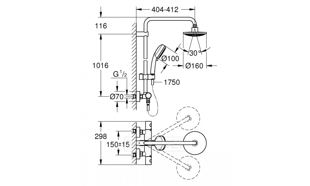 Душевая система с термостатом для настенного монтажа, состоит из: