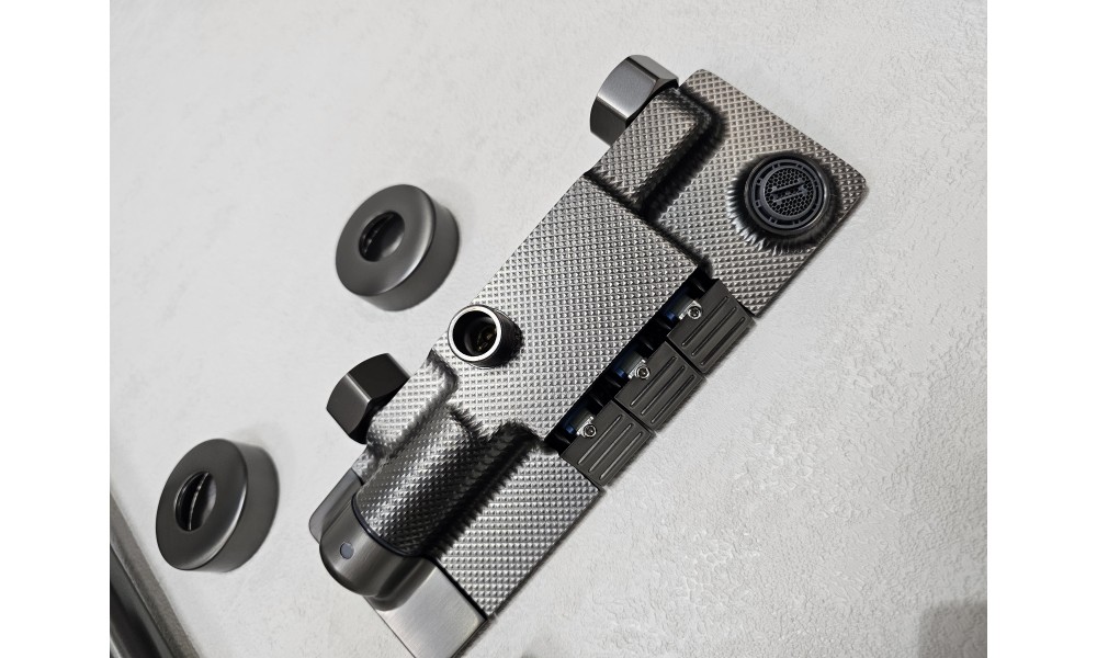 Душевая система кнопочная (клавишная панель управления) Ledeme L2418D, в цвете Оружейная|Вороненая сталь. Материал: Авиационный алюминий. Высота штанги от корпуса: от 750 до 1450 мм (75 до 145см). Гарантия: 5 лет