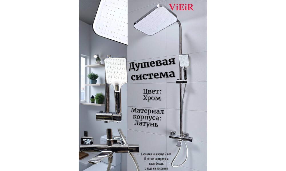 Душевая система ViEiR V473062, выполненная в хромированном исполнении, оснащена поворотным изливом, душевой лейкой и верхним тропическим душем. На корпус изделия предоставляется гарантия сроком на 7 лет, на картридж, кран-буксу — на 5 лет, на покрытие — на 3 года, на комплектующие — на 1 год.