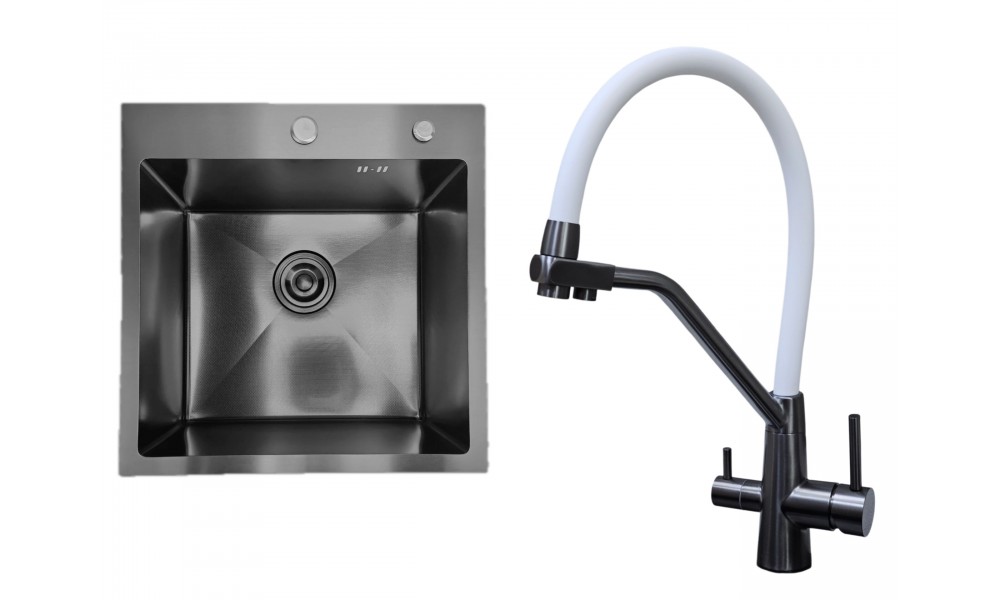 Комплект Кухонная мойка Astaria A5050NB-D1, Чёрный-Графит + Смеситель для кухни Fmark FS0662-Q02, Оружейная сталь + Белый силиконовый излив