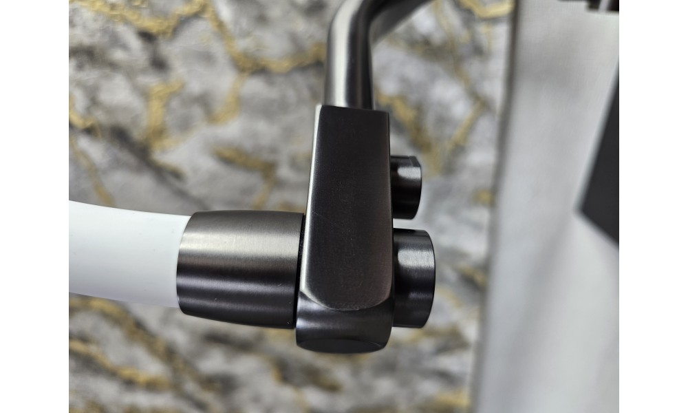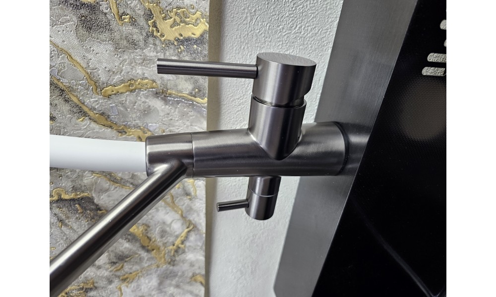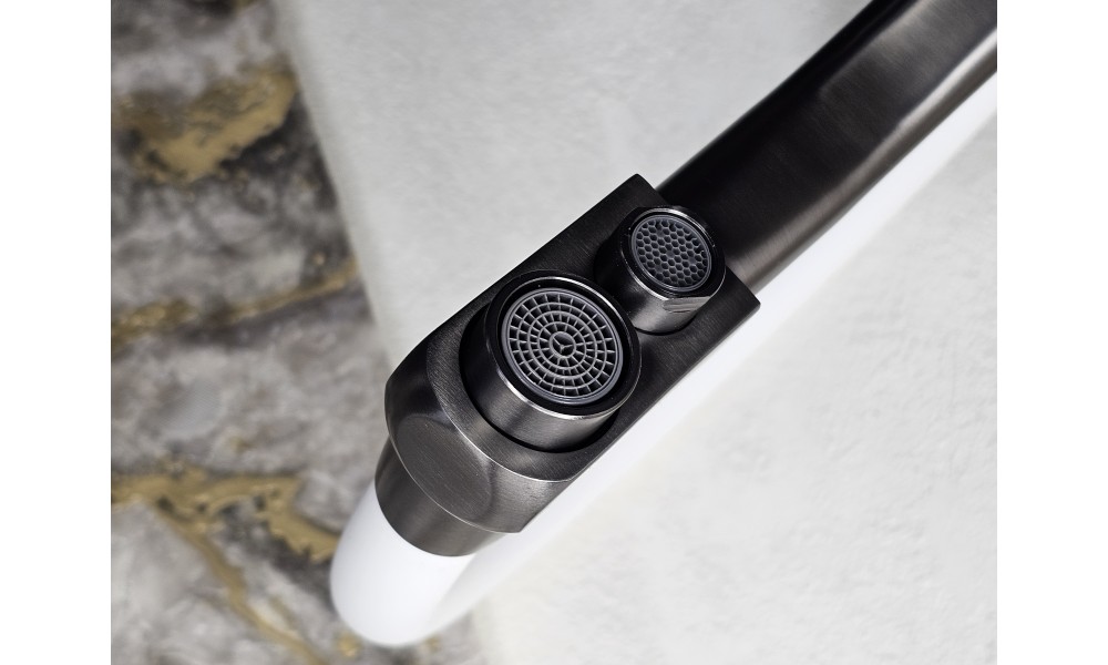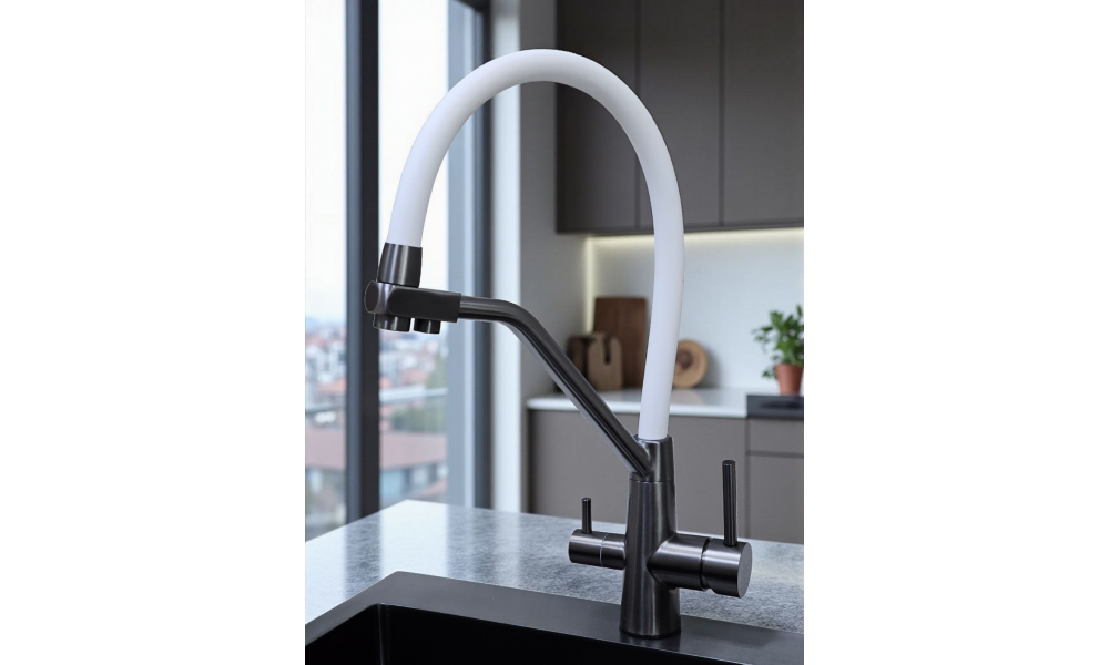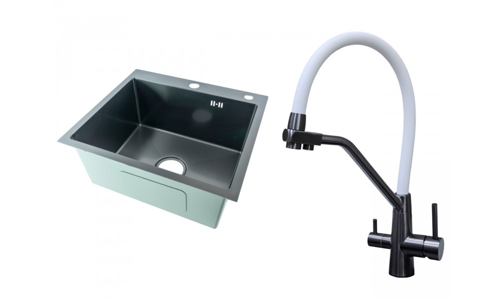 Комплект Кухонная мойка Fmark FSC5045Q, Графит + Смеситель для кухни Fmark FS0662-Q02, Оружейная сталь + Белый силиконовый излив