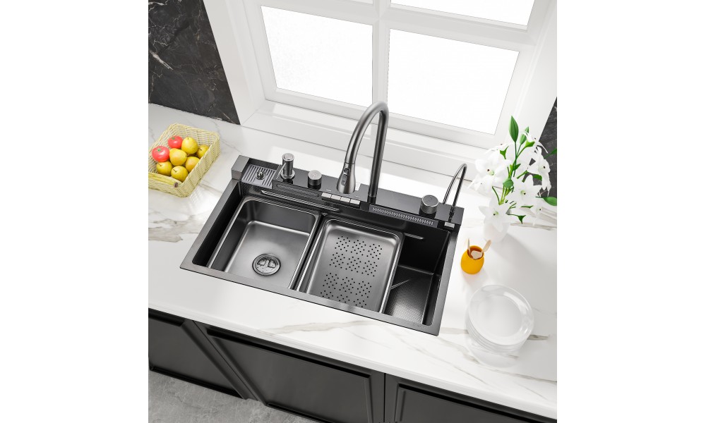 Многофункциональная кухонная мойка из нержавеющей стали Savol S-SC001Q, Цвет мойки: Графит/Чёрный, Толщина 3 мм бортики, 1.2 мм чаша, тыльная сторона мойки покрыта вибропоглощающим (прорезиненным) материалом и специальной грунтовкой, чтобы предотвращать шум, размер мойки: 75х46 см. размер чаши: 35 х70 см. глубина чаши: 22 см.
