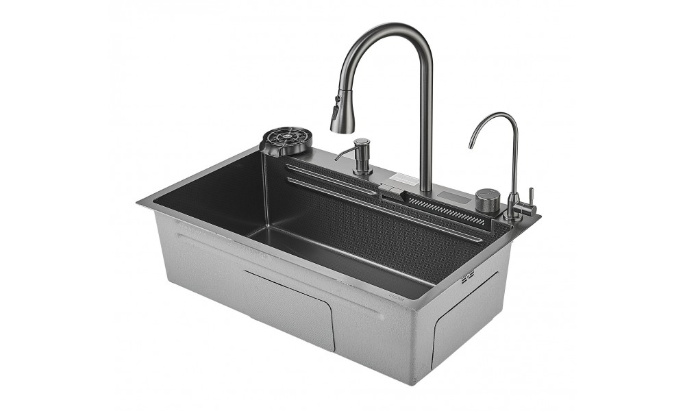 | Комплектация поставки | Кухонная мойка, смеситель с выдвижным изливом и индикцией температуры, ринзер для ополаскивания стаканов, краник для фильтрованной воды, сливная арматура, дозатор для мыла, коландеры 2шт., деревянная доска, крепеж, гарантийный талон |