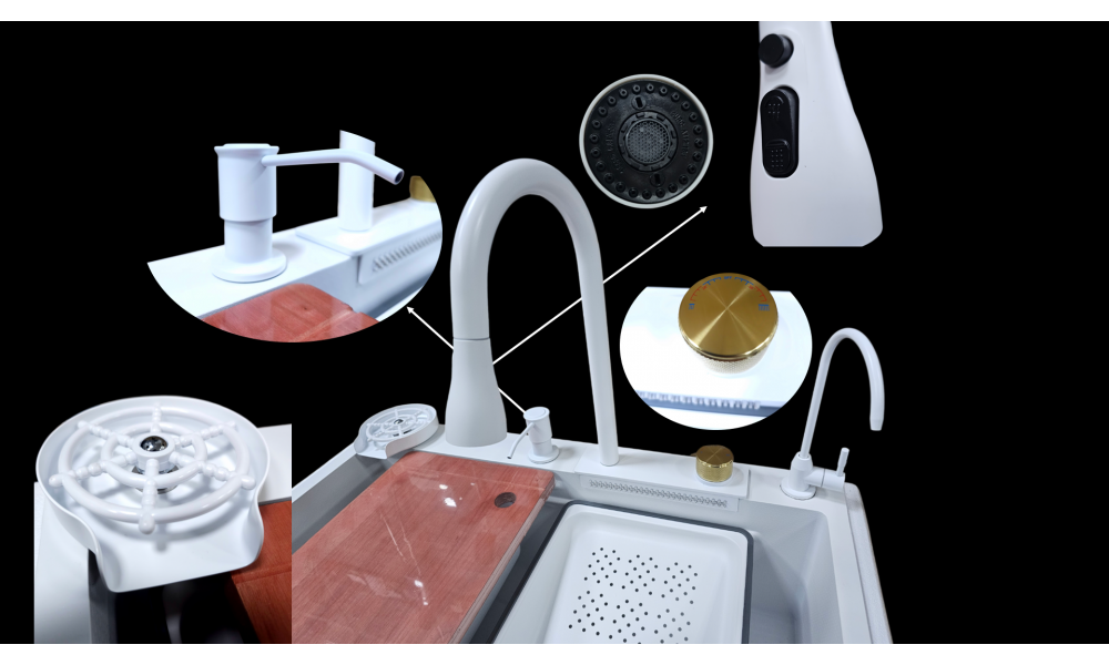 | Комплектация поставки | Кухонная мойка, смеситель с выдвижным изливом и индикцией температуры, ринзер для ополаскивания стаканов, краник для фильтрованной воды, сливная арматура, дозатор для мыла, коландеры 2шт., деревянная доска, крепеж, гарантийный талон |