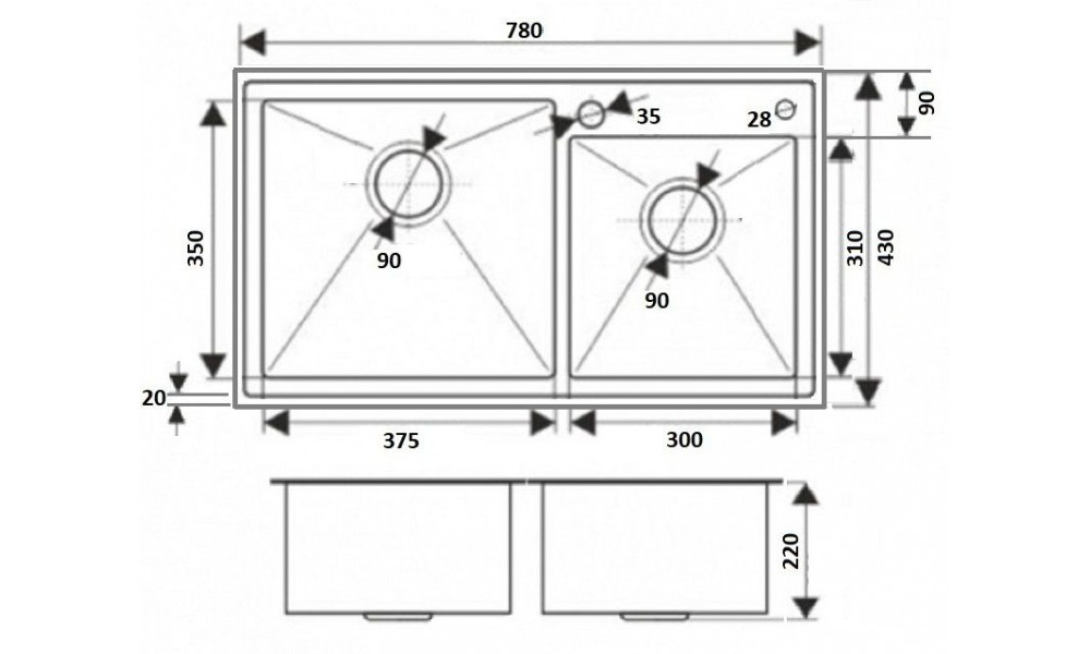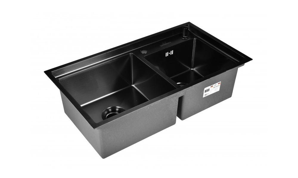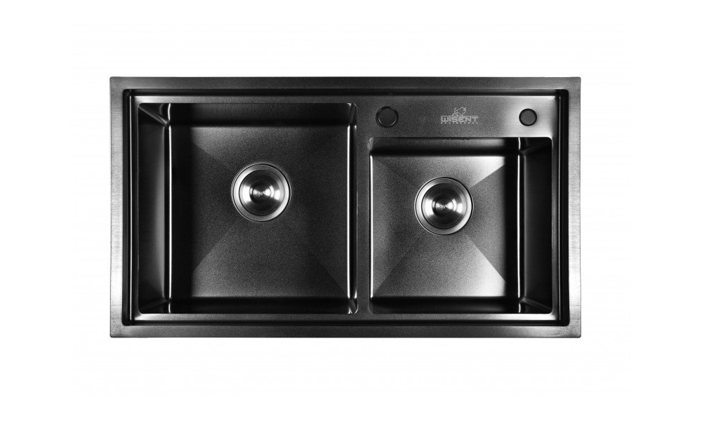 Кухонная мойка из нержавеющей стали с двумя чашами Wisent WS7843B-S, Толщина 3 мм бортики, 1.2 мм чаша, тыльная сторона мойки покрыта шумоизолирующим слоем. размер мойки: 78х43 см. размер чаши: 1 чаша 35x37,5 см., 2 чаша 30x31 см. глубина чаши: 22 см.