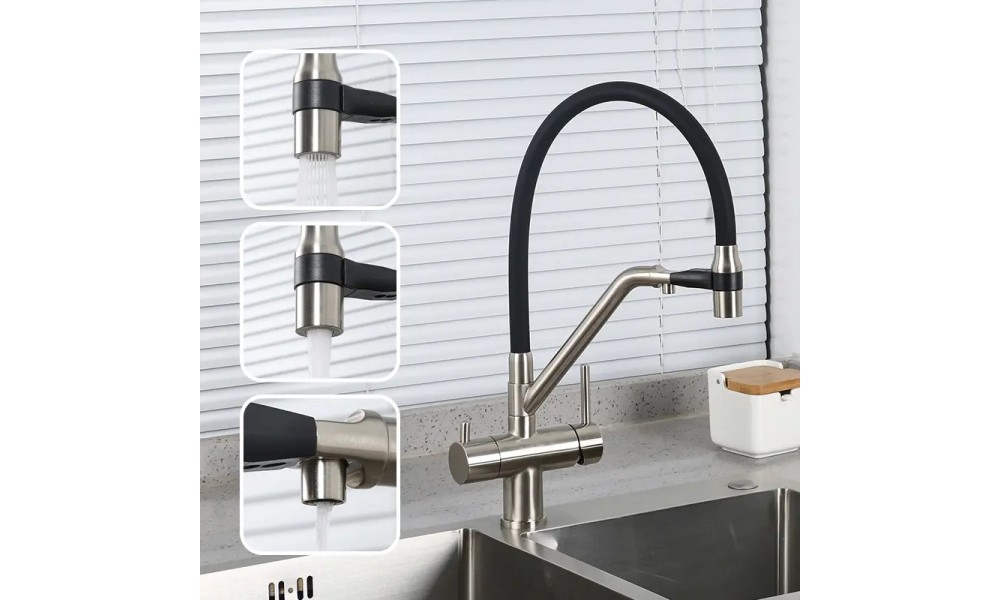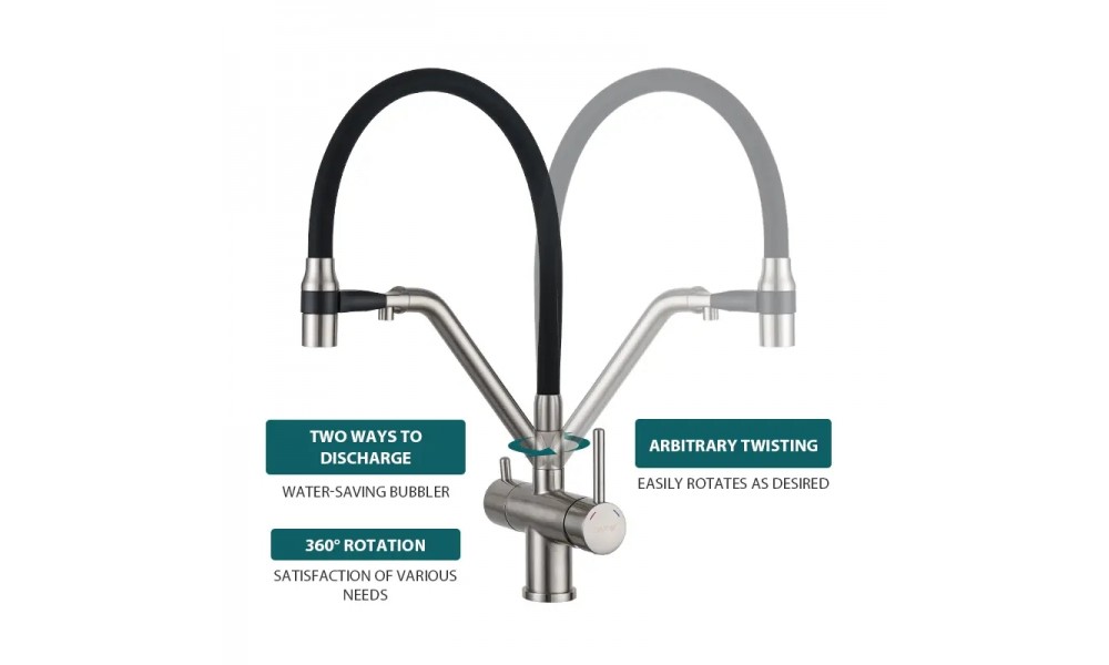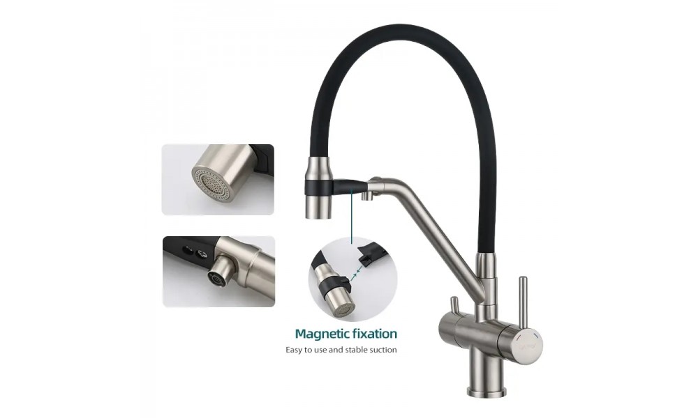 Смеситель для кухонной мойки с магнитной фиксацией силиконового излива к смесителю, два режима (струи) подачи обычной воды, аэратор поворотный с перек..