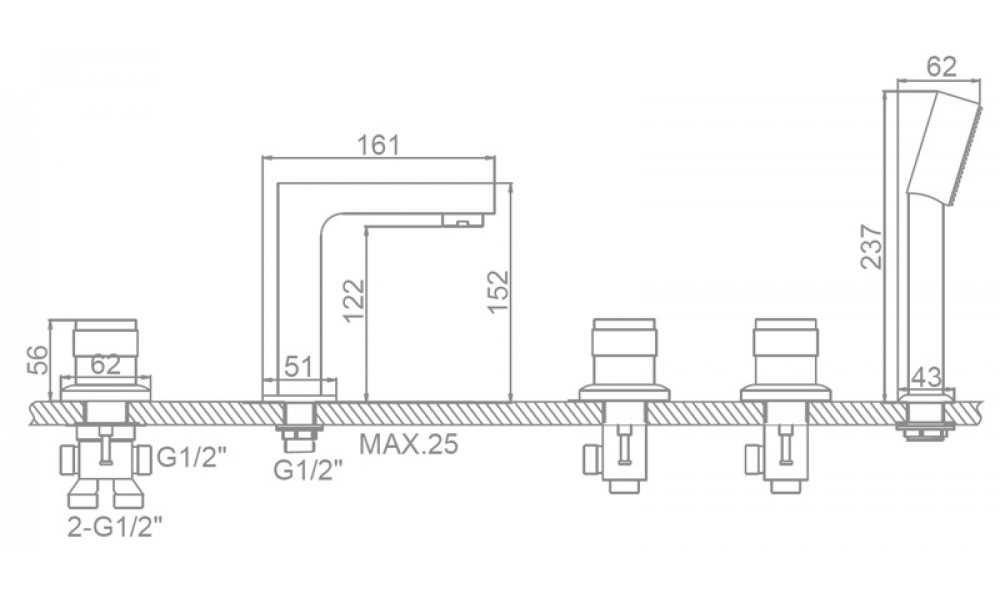 Смеситель на борт ванны 5в1 Ledeme L1187